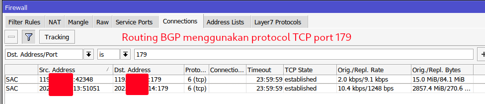 Contoh Pembacaan Traffic BGP. Protocol = TCP. Port : 179.
