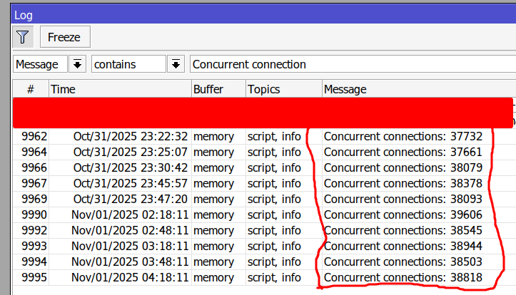 - melihat manual bisa dengan cara mengakses menu Log di Mikrotik melalui winbox, akan ada message concurrent connection = ……